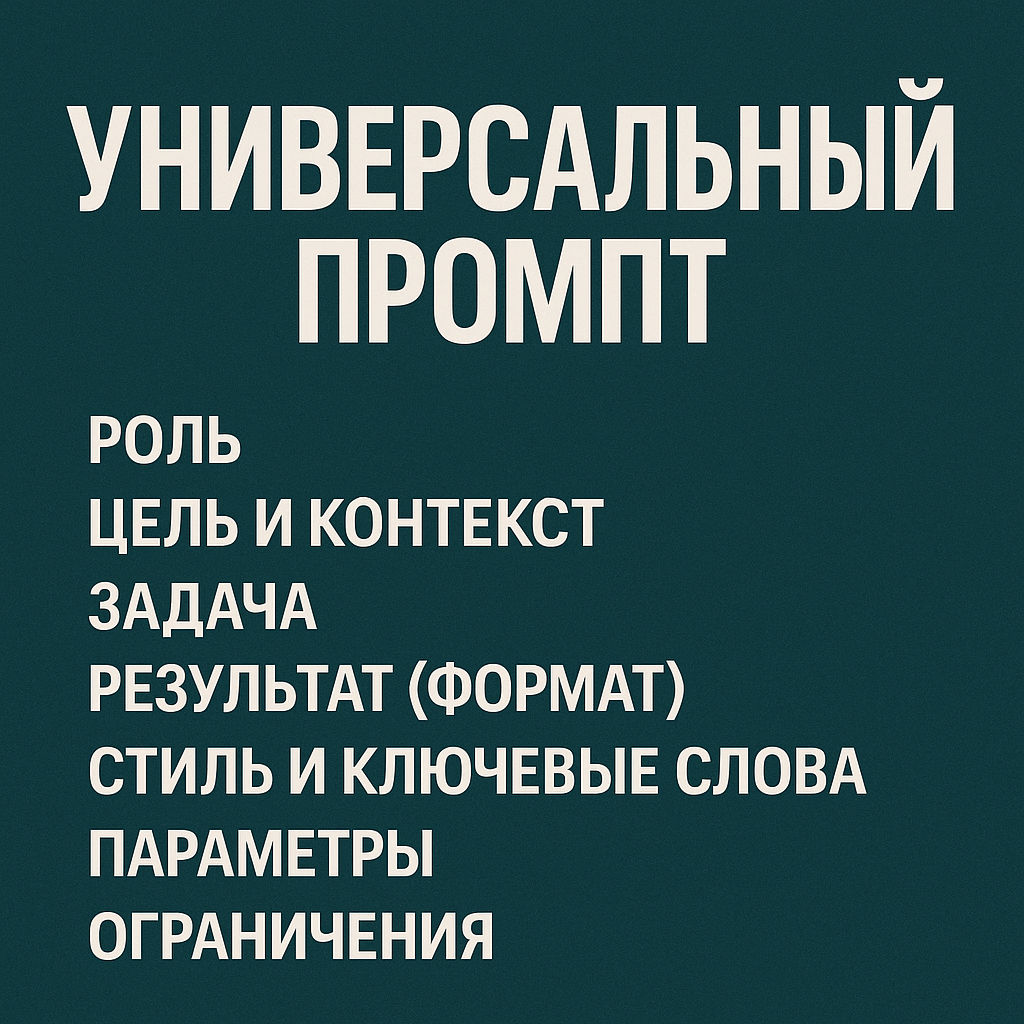Универсального промпта не существует. Но существует универсальная структура, которая позволяет получать именно те ответы, которые нужно. Мы пришли к этой структуре после множества неудачных попыток, когда нейросеть понимала задачи слишком абстрактно и выдавала бесполезные результаты. 🤖